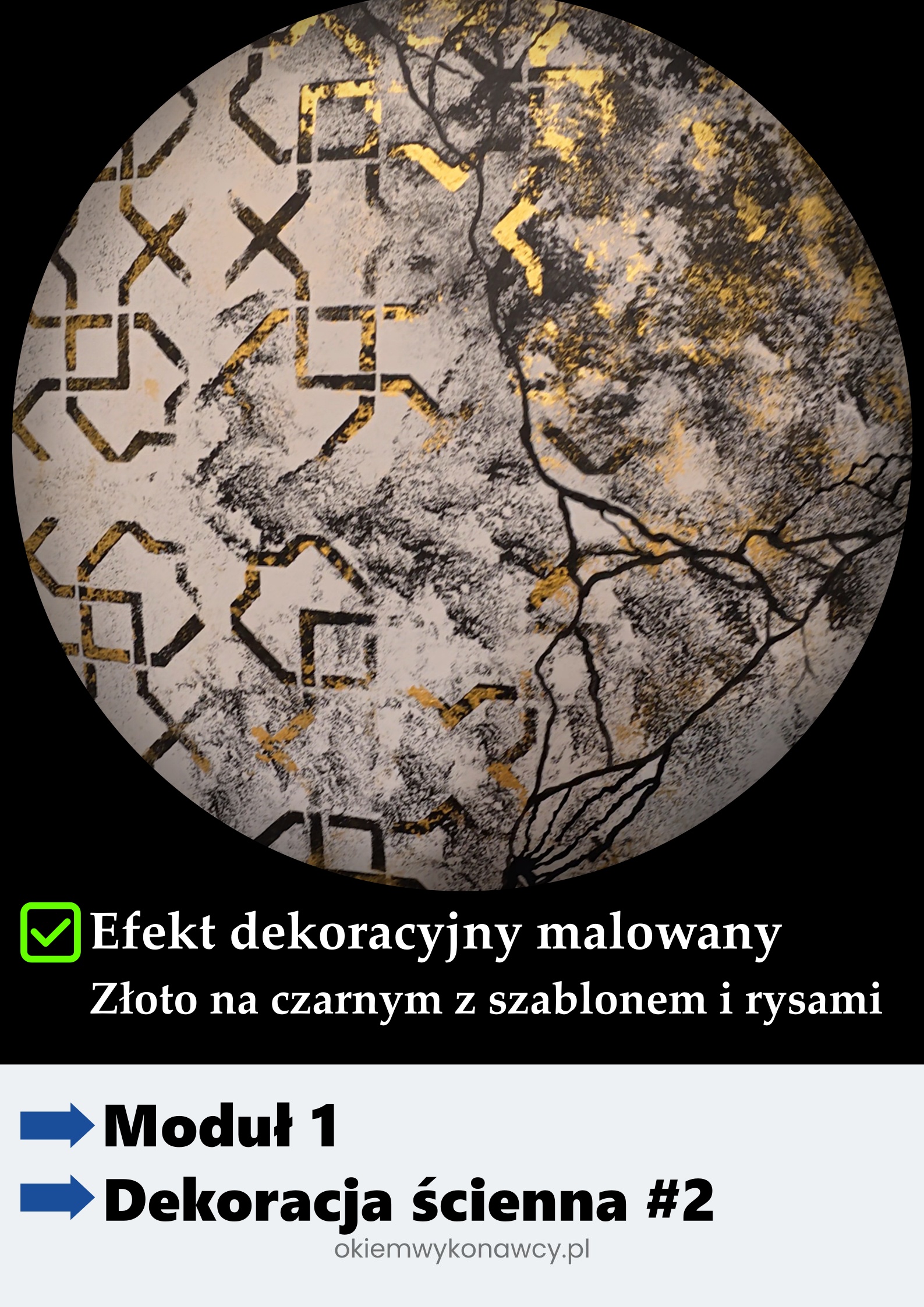 - Lekcja 2. Wykonanie dekoracji „Złoto na czarnym z szablonem i rysami” – od podłoża do efektu końcowego KROK po KROKU ze wszystkimi szczegółami.