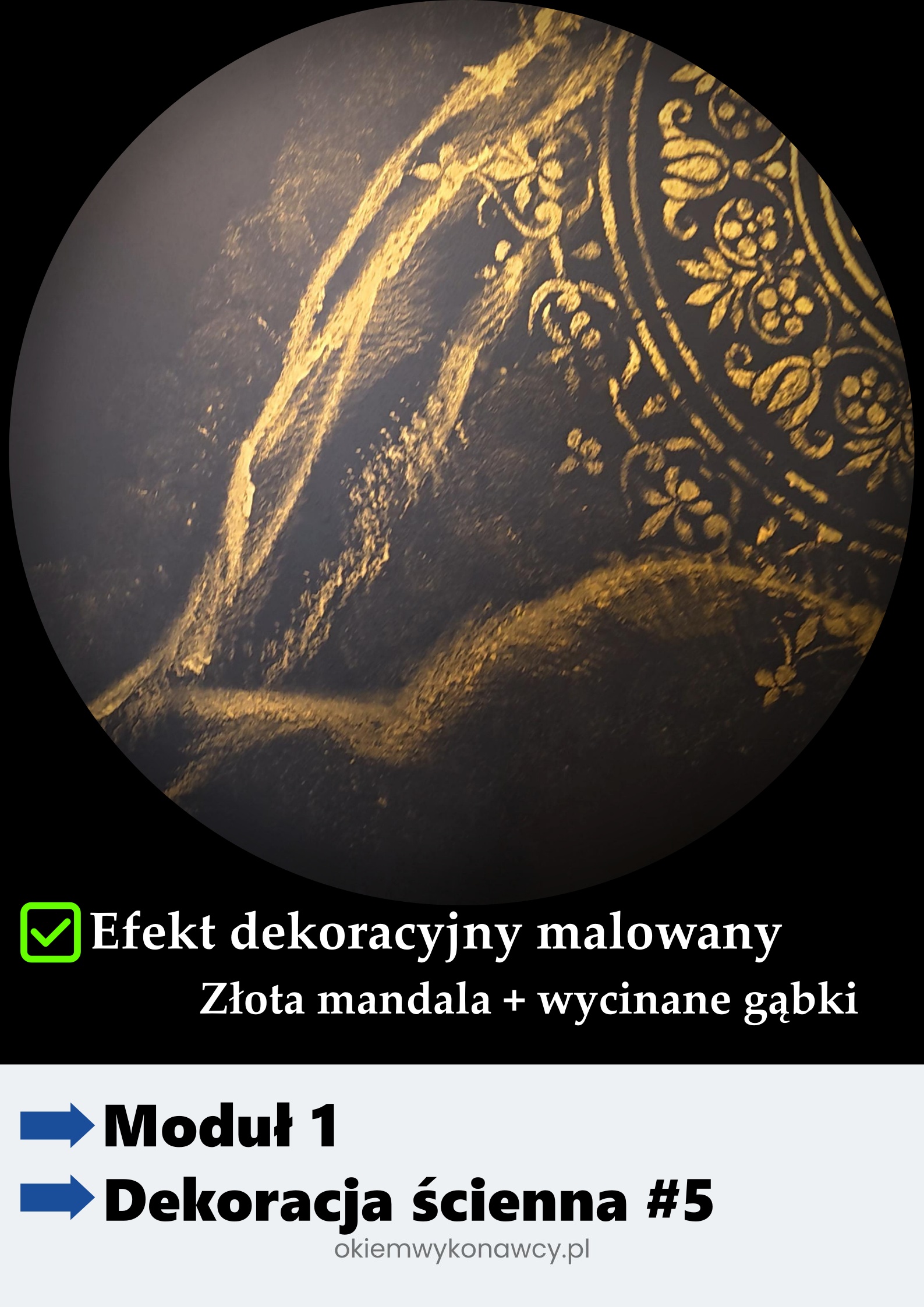 - Lekcja 5. Wykonanie dekoracji „Złota mandala + wycinane gąbki” – od podłoża do efektu końcowego KROK po KROKU ze wszystkimi szczegółami.